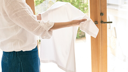 素材の特性上、他の洗濯物から出た汚れを取り込んでしまうこともあるため、他の洗濯物と分けて、手洗いでしっかり汚れを落とすことをおすすめします。